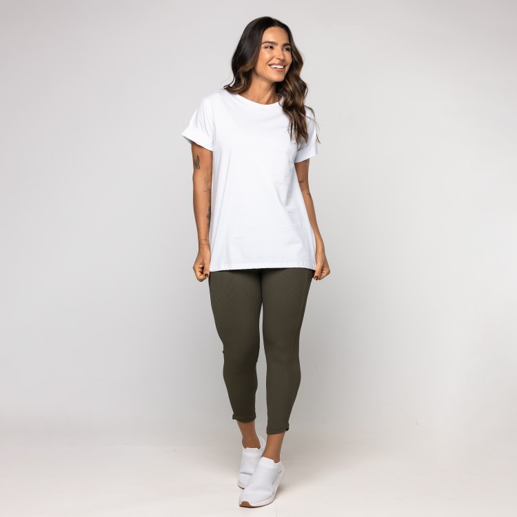 Confeccionada em malha 100% algodão, tem modelagem reta, caimento leve e o detalhe das mangas dobradas, que adiciona um toque de feminilidade e estilo.