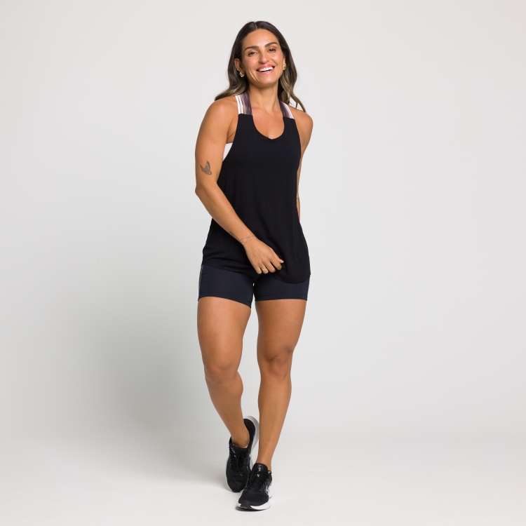 A Regata Angelina possui modelagem nadador, com as alças cruzadas nas costas em elástico degradê. Esse estilo confere um visual esportivo e ao mesmo tempo feminino, valorizando os ombros e as costas. Com uma modelagem mais soltinha ela é perfeita para criar looks estilosos e versáteis. Com uma liberdade de movimento proporcionada pela modelagem nadador. Essa peça se tornará uma escolha certeira para adicionar um toque de elegância ao seu guarda-roupa.
