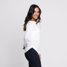 O modelo conta com abertura para o dedo nas mangas, que traz mais praticidade e um visual moderno, além do detalhe em franzido lateral, acrescentando charme e delicadeza à peça.